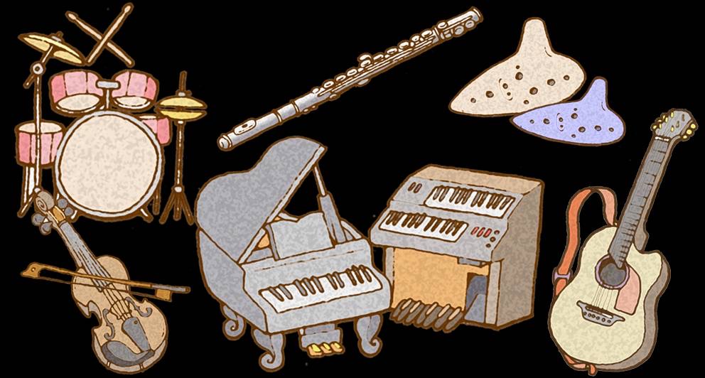 ピアノ、エレクトーン、フルート、ヴァイオリン、アコースティックギター、オカリナ、ドラムスのレッスンをご用意しています。